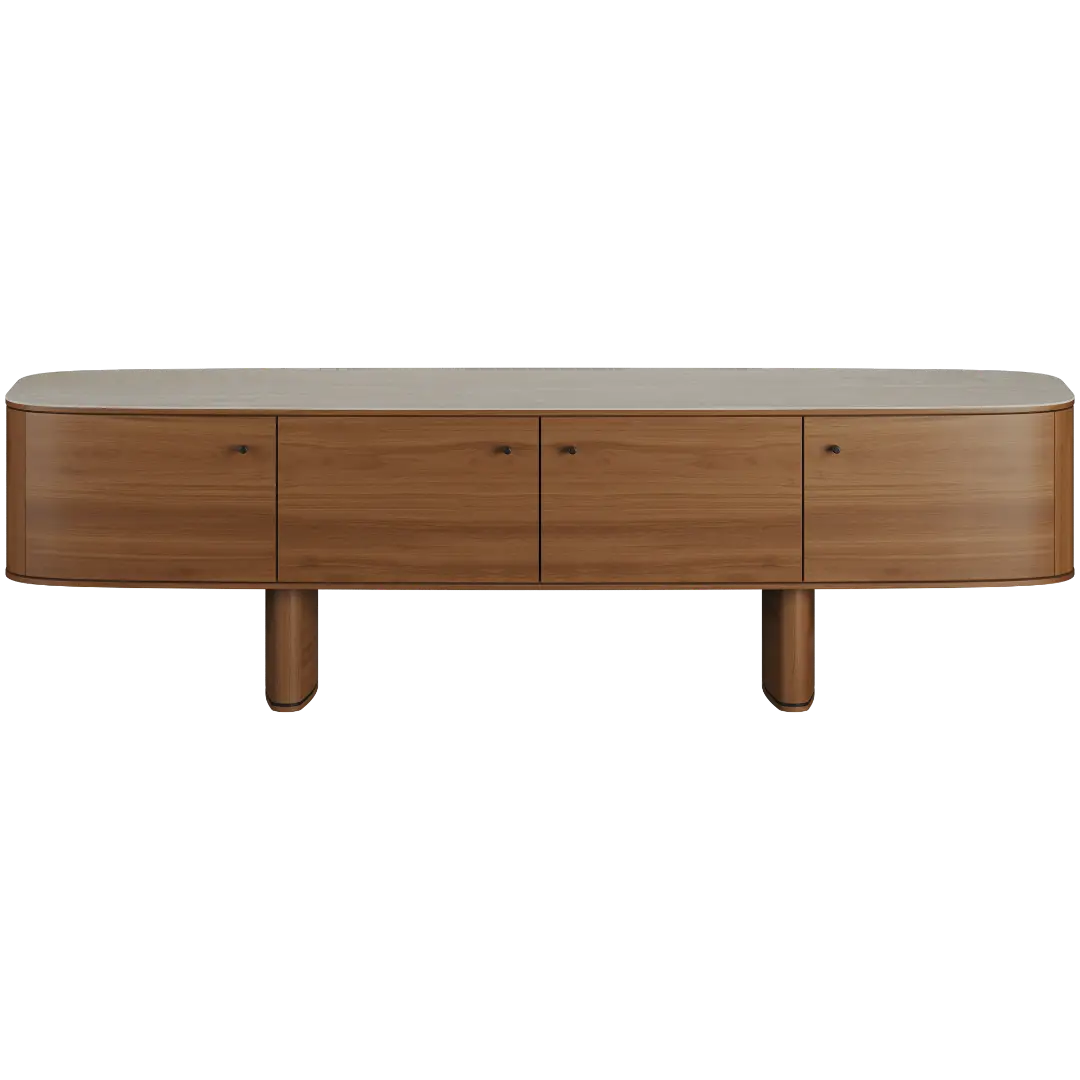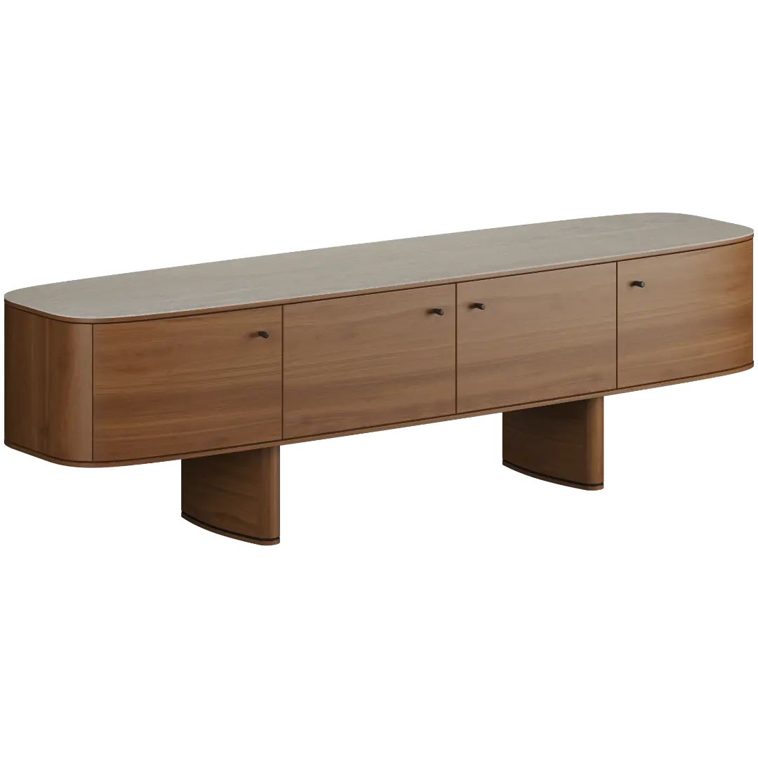 Fabbri — это ТВ-тумба, которая создаёт ощущение архитектурной завершённости пространства: мягкие радиусные линии, глубокая текстура натурального шпона, монументальная устойчивость и точность пропорций.