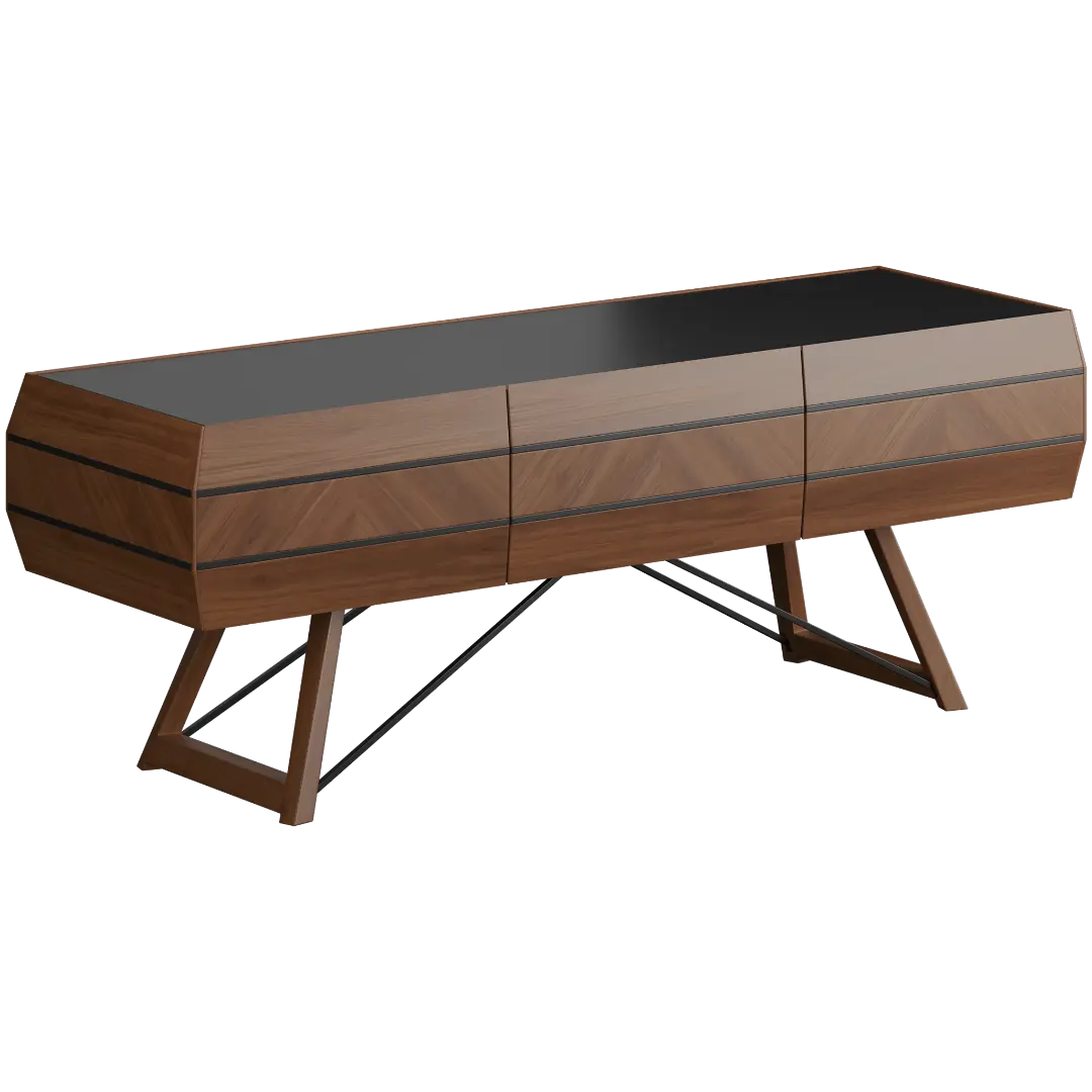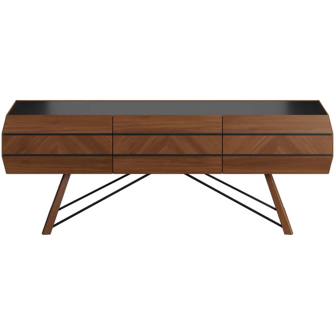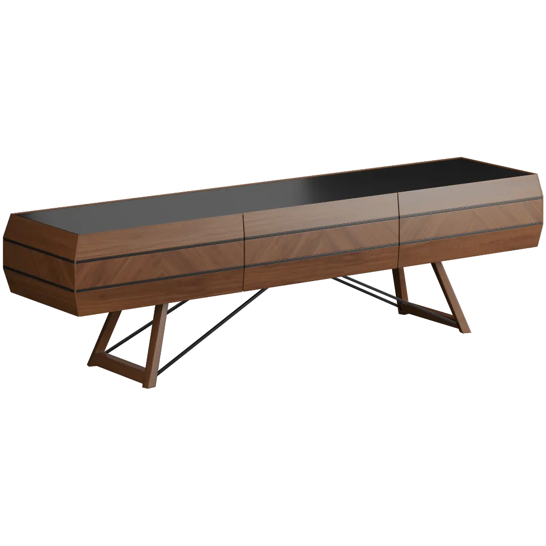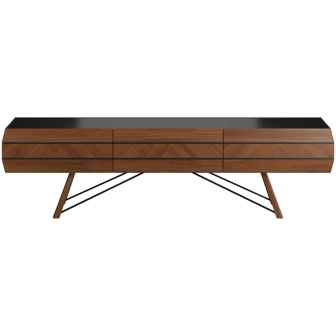 ТВ-тумба из коллекции Grassi — это гармония классики и современности. Основание выполнено из металла с оригинальной диагональной конструкцией, что придаёт изделию лёгкость и устойчивость. Корпус из шпонированного МДФ с фасадами из наборного шпона американского ореха, уложенного рисунком «ёлочкой», подчеркивает благородный характер коллекции.