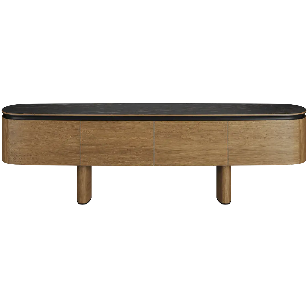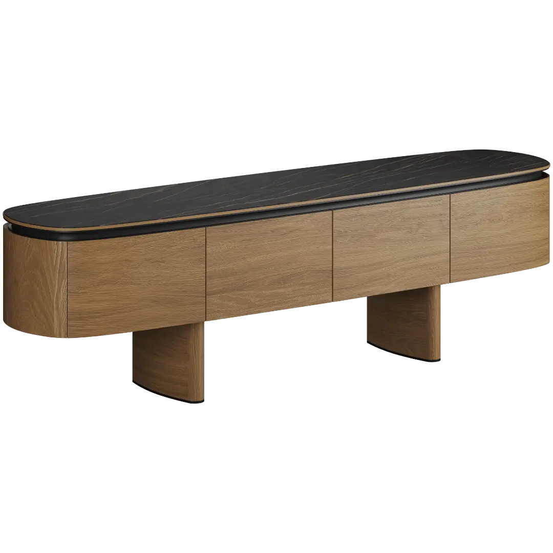 Тумба состоит из четырёх секций с распашными дверцами, которые обеспечивают удобное хранение и сохраняют при этом цельный минималистичный облик фасада. Особое внимание привлекают ножки — они имеют плавную изогнутую форму, повторяющую радиус корпуса, и визуально создают впечатление лёгкости при высокой устойчивости конструкции.