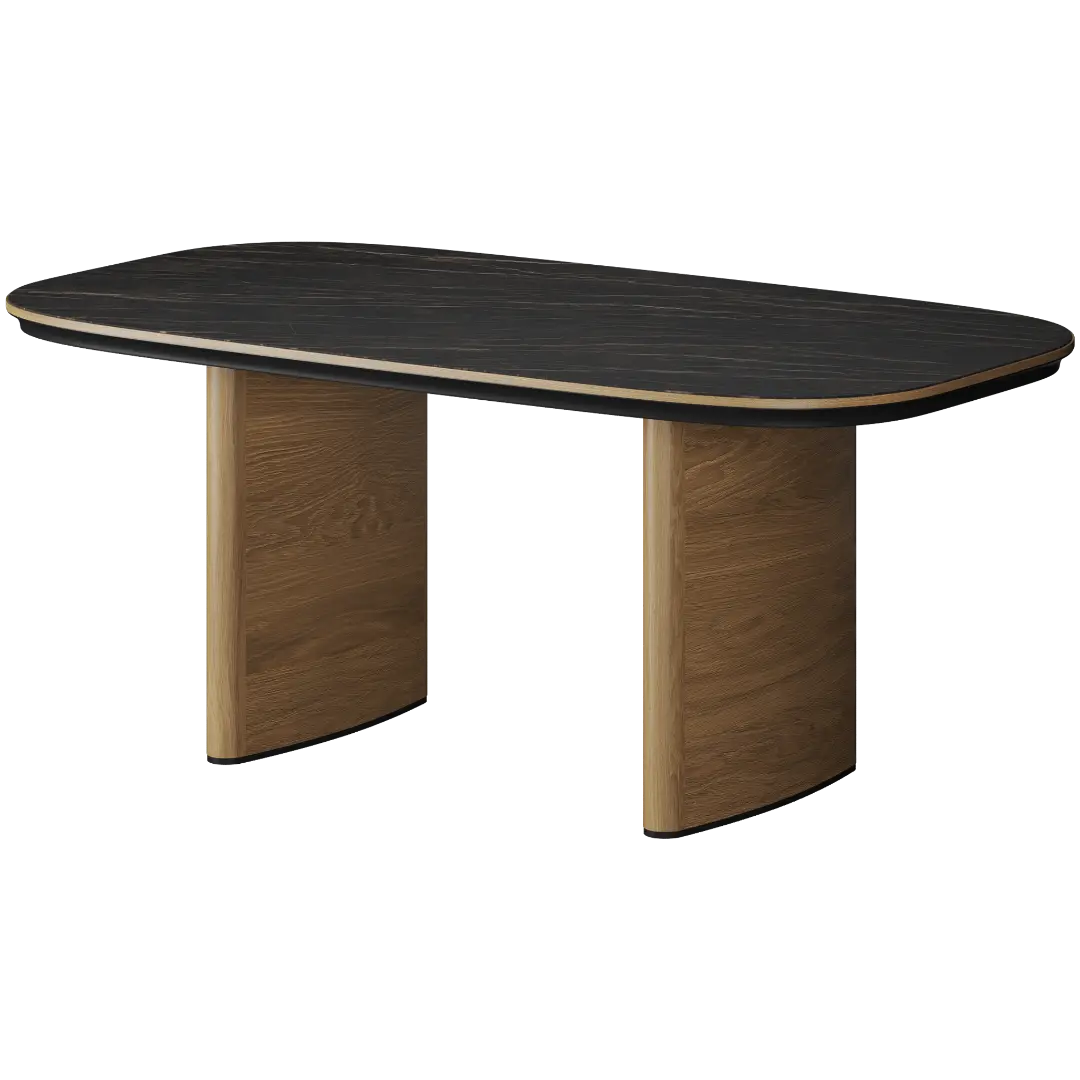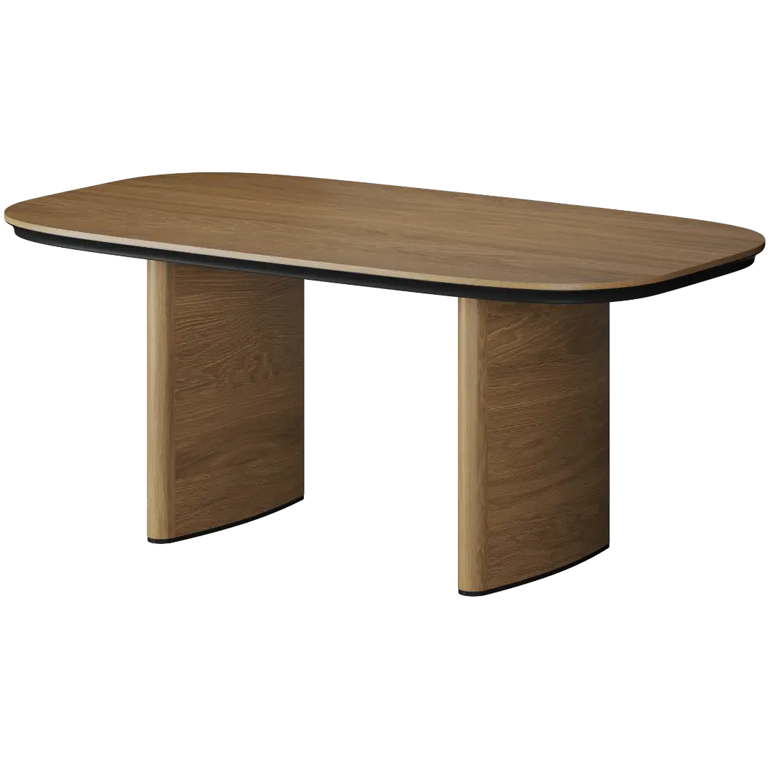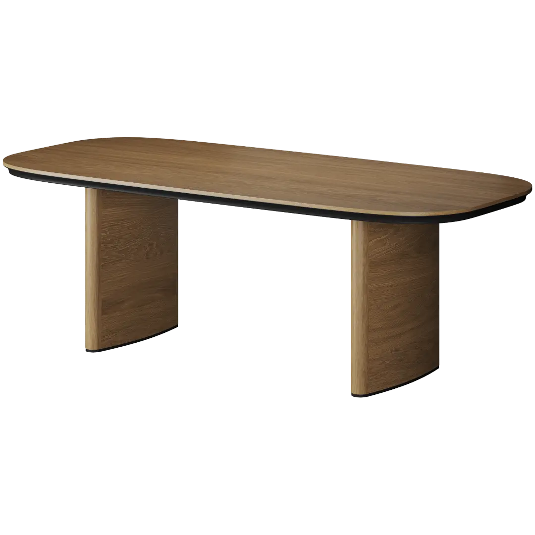 Ножки и каркас выполнены из шпонированного МДФ в двух премиальных оттенках — натуральный дуб или американский орех, что позволяет адаптировать стол под ваш стиль. Столешница из шпона дополнена акцентной вставкой из эмали, а встроенное ребро жёсткости гарантирует прочность и долговечность.